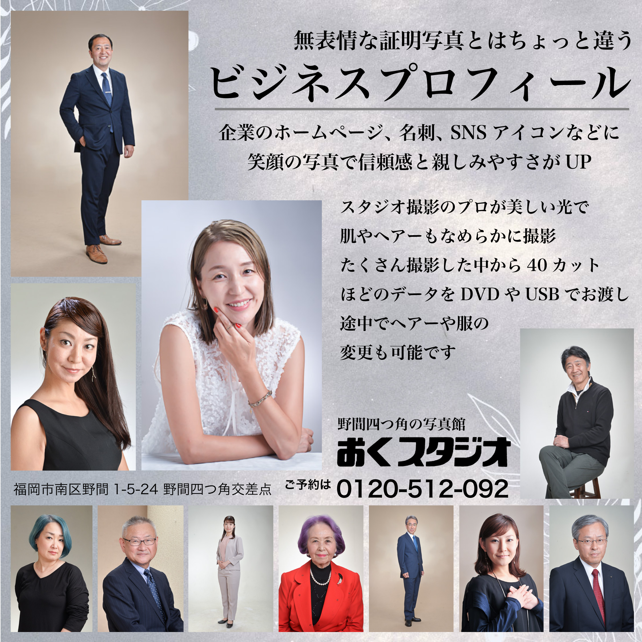福岡市南区野間四つ角、コンサートやリサイタルのチラシ撮影からデザインと印刷まで、履歴書、パスポート用、エアライン受験、家族の記念写真、七五三やお宮参り、成人式や就職活動、オーディション、宣材写真、など
